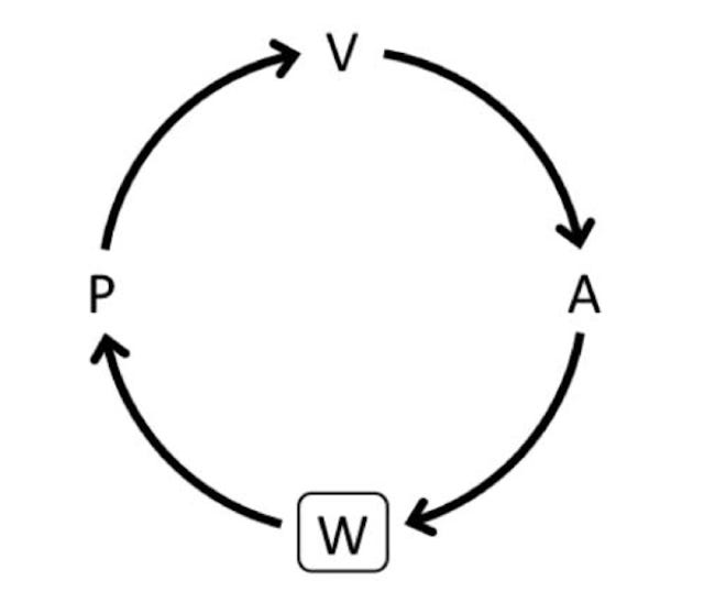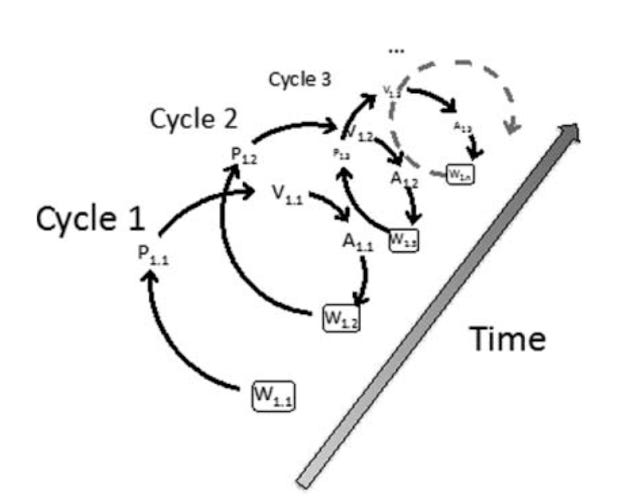 Dans chaque cycle d’évaluation, les changements dans les « W » entrainent des changements dans la perception, qui se répercutent sur l’évaluation et l’action ultérieures. Ainsi, le premier cycle de valorisation est noté W1.1-P1.1-V1.1-A1.1, le second est noté W1.2-P1.2-V1.2-A1.2, et ainsi de suite.